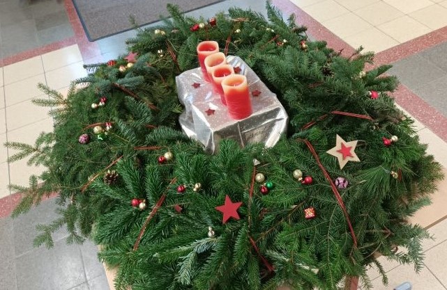 Der große Adventskranz wird wieder zum sichtbaren Zeichen für unsere Gemeinschaft innerhalb der Schule.