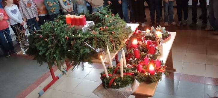 Zum Schluss wurde unser Kranz in der Aula und unsere Adventskränze aus den Klassenzimmern gesegnet. Während der kleinen Feierstunde sangen wir gemeinsam einige Adventslieder.