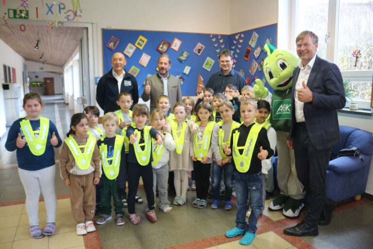In der Aula begrüßten wir unsere Gäste, Herrn Schulrat Markus Winkler, sowie Vertreter der Verkehrswacht und der AOK zusammen mit Maskottchen Jolinchen mit einem Lied. Wir erfuhren u. a. von unseren Gästen, wie wichtig es ist, im Straßenverkehr gesehen zu werden und wie viele Warnkrägen insgesamt verteilt worden sind. Danach posierten wir stolz mit den neuen Warnkrägen für die Zeitung und einige Schülerinnen und Schüler durften sogar ein kleines Radiointerview geben.